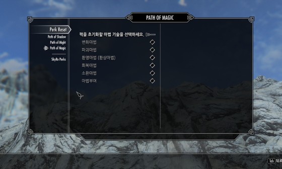 스카이림 퍽 초기화 모드 능력치 재설정 초기화 리셋