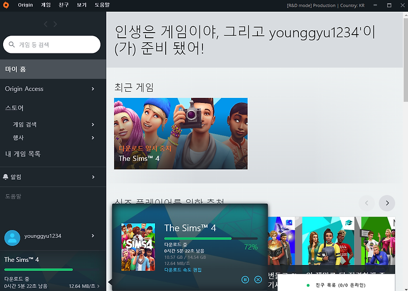 오리진 다운로드 속도 R D 모드 활성화로 빠르게