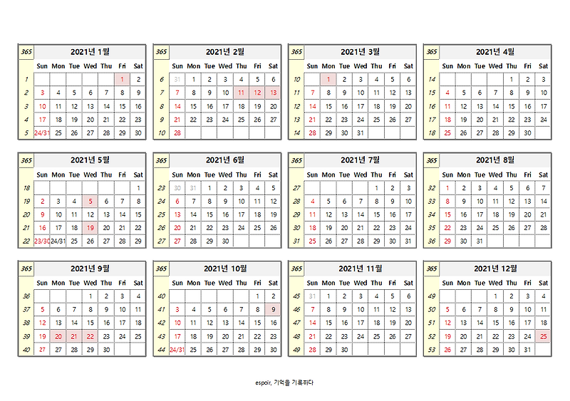 2021년 주차별 달력 52주달력 엑셀달력 무료다운로드