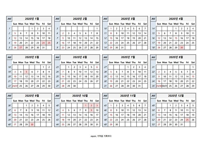 2020년 주차별 달력 엑셀